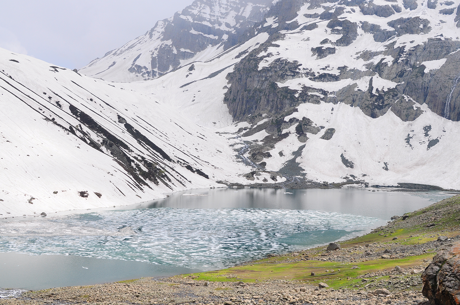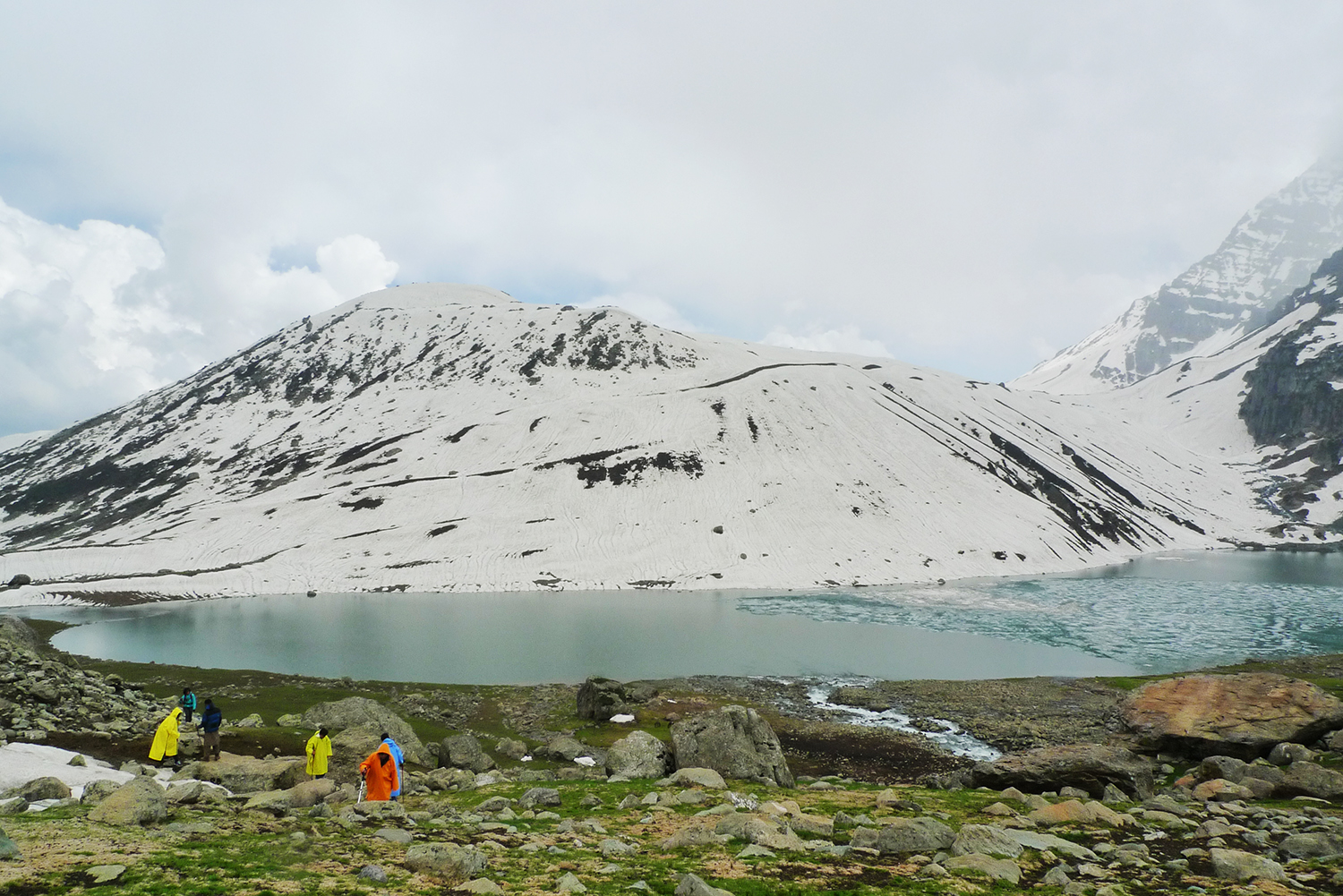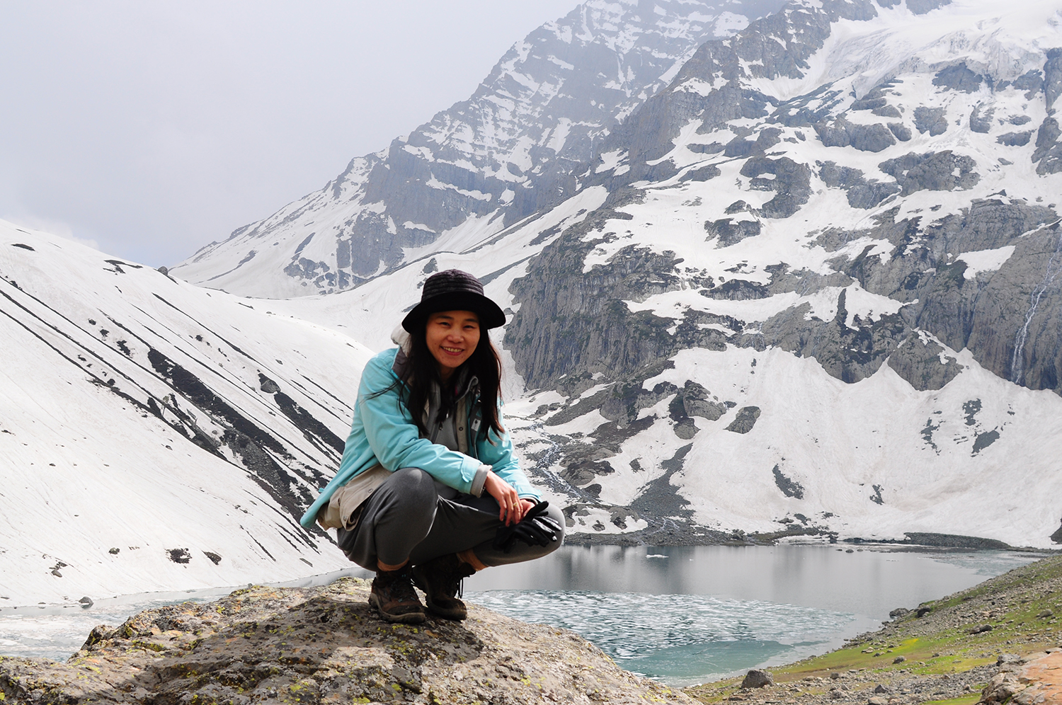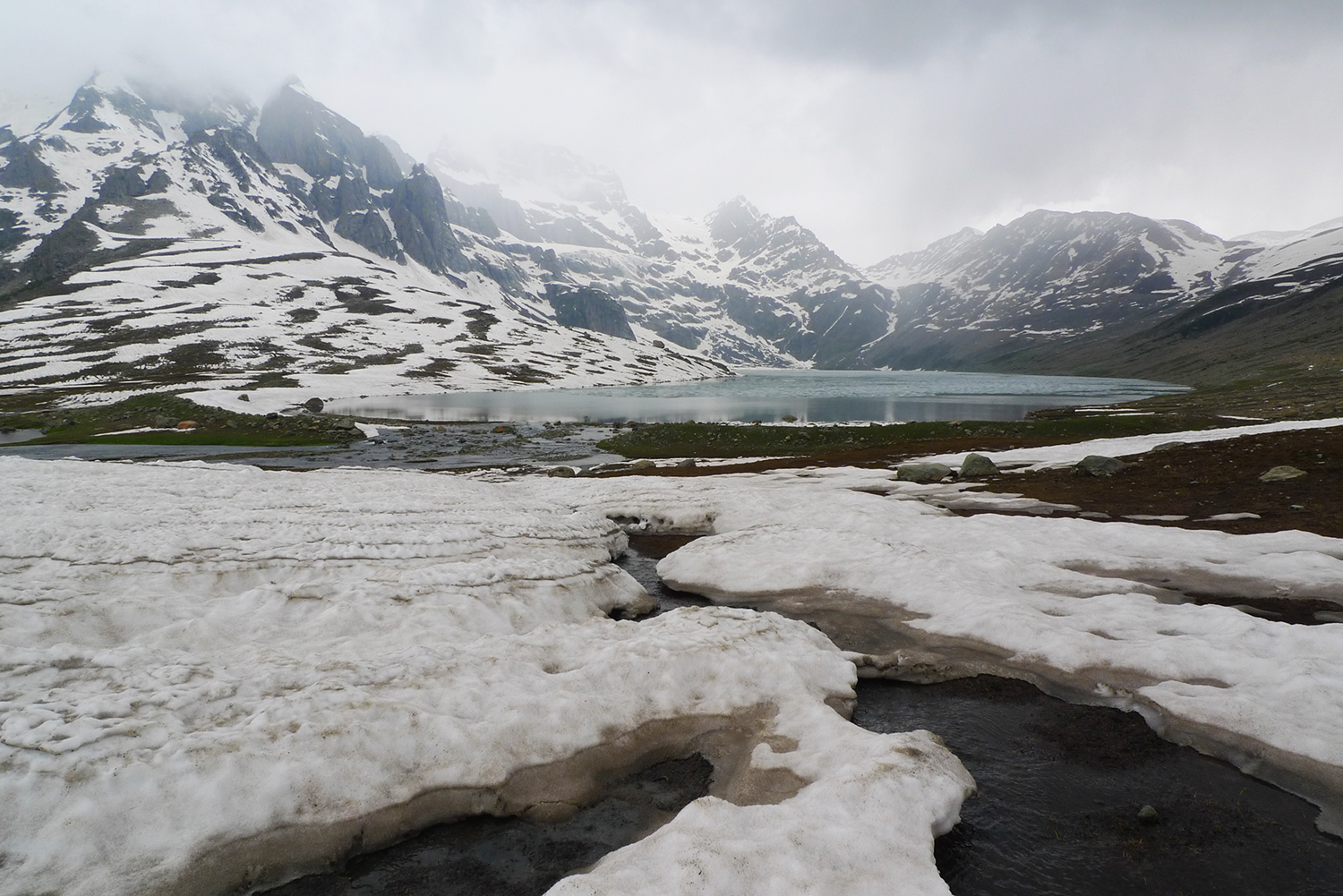 終於順利上到Gangabal湖了。離上次上山不過一個禮拜,沿路上依舊深雪覆蓋,湖面漂浮片片薄冰,Haramukh山埋在深厚的雲霧裡。想,如果上次勉強攀過埡口,可以多靠近?