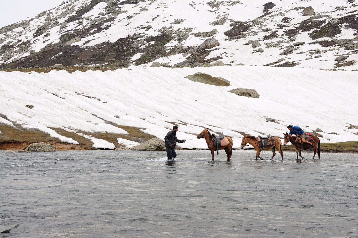 因為融雪,河面拓寬外,過河的小橋也已被沖垮。馬伕們脫下鞋子、捲起褲管,一個個接送我們過河往Gangabal大湖前進。