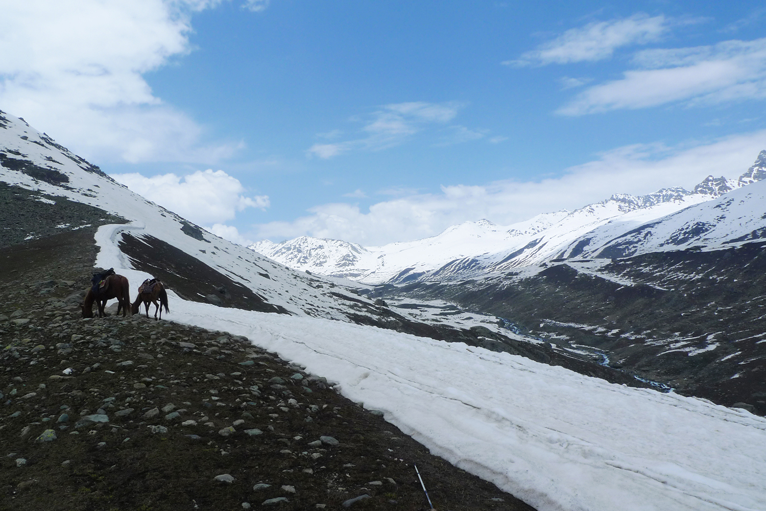 第三天天氣變好了,但往Gangabal的路上還是被殘雪擋住去路。雪滑,不小心可能就會滑下山谷。